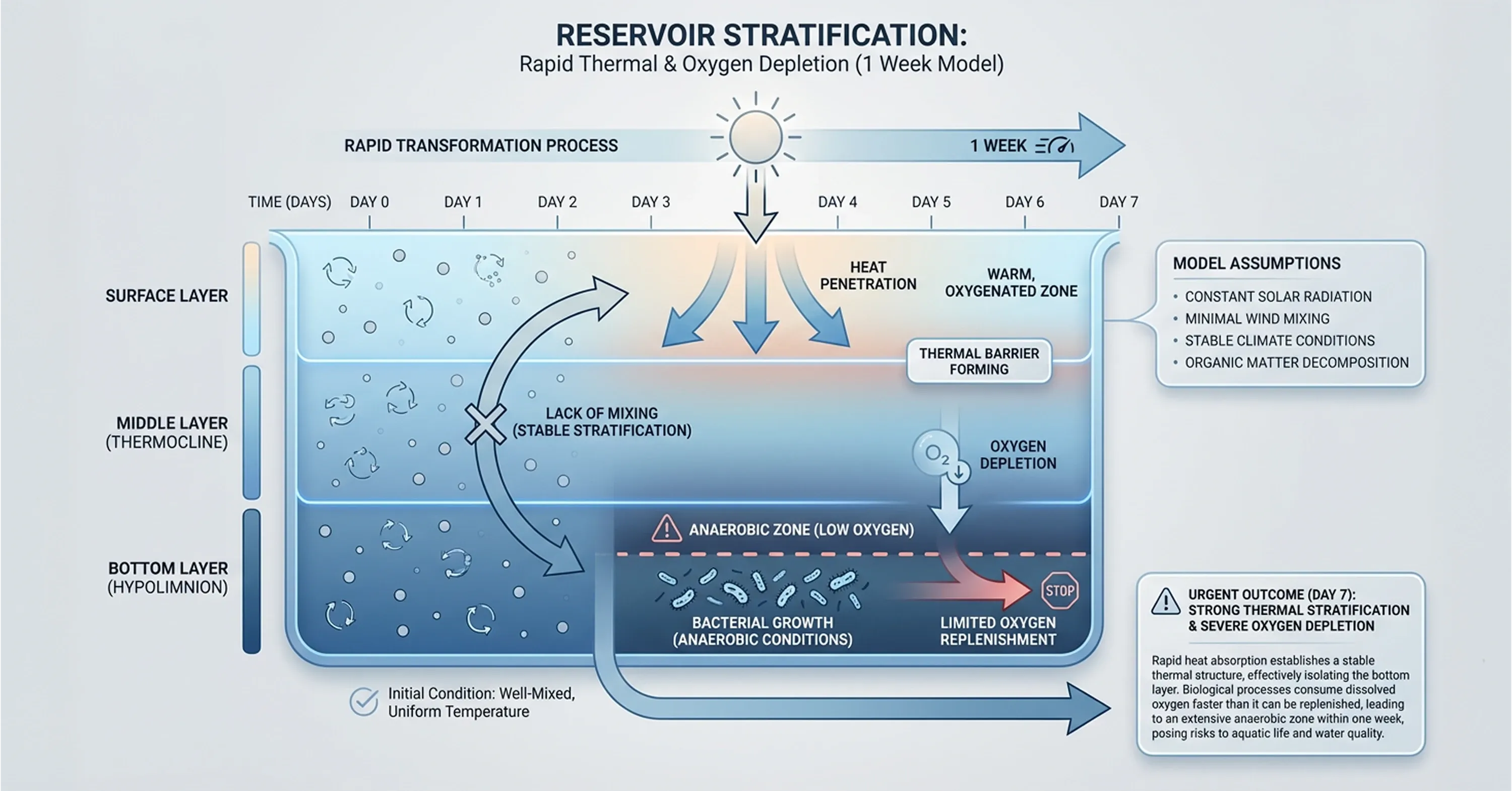 In summary, reservoir water quality follows a predictable biological and chemical sequence that involves stratification, oxygen loss, pathogen proliferation, nutrient release, and evaporative concentration. Each stage builds on the previous one significantly faster than standard temperate-region models suggest.