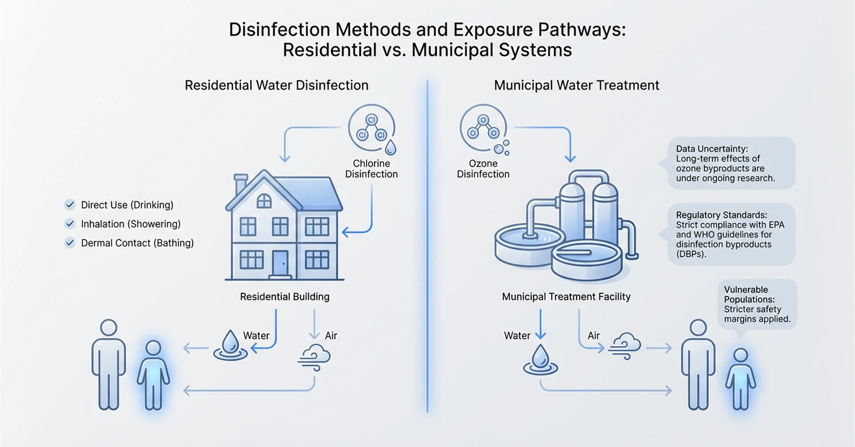 This gas migration shows how health risks from wastewater disinfection change dramatically when treatments occur inside residential buildings rather than at municipal plants. Residential systems create two distinct exposure paths depending on the chosen technology. Residual chlorine creates chemical byproducts that remain in the water, and ozone systems introduce the risk of gas leaks into indoor air.