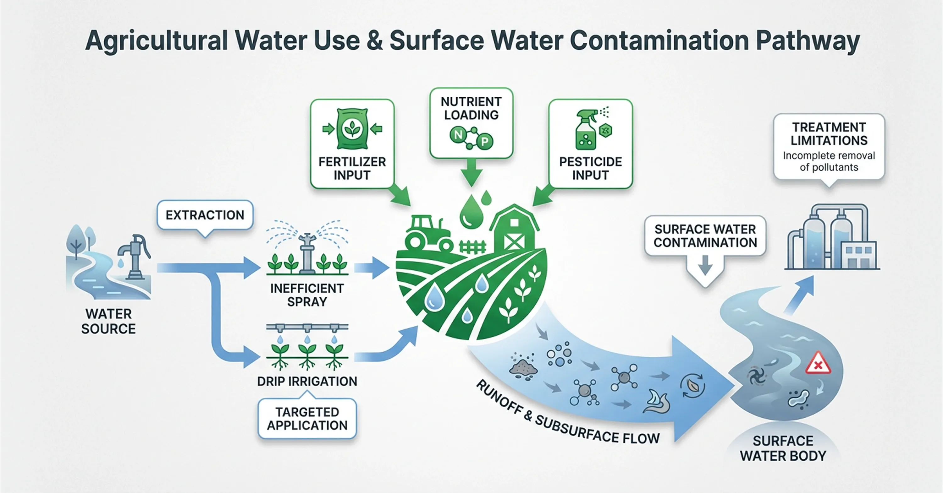 Agriculture stands as the single largest driver of surface water contamination across the region because the sector consumes nearly two-thirds of available freshwater. Farmers apply synthetic fertilizers and chemical pesticides to maintain crop yields in arid conditions. When water flows across these fields, it captures these chemicals and carries them into local rivers and aquifers.